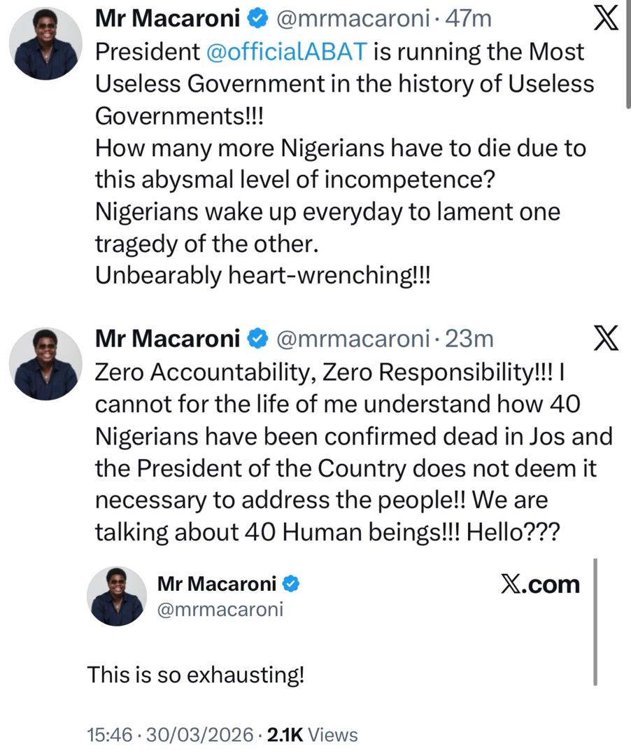 Activist Adebowale Adebayo aka Mr Macaroni has slammed President Tinubu for failing to speaking to Nigerians hours after gunmen stormed Anguwan Rukuba, Jos North Local Government Area.